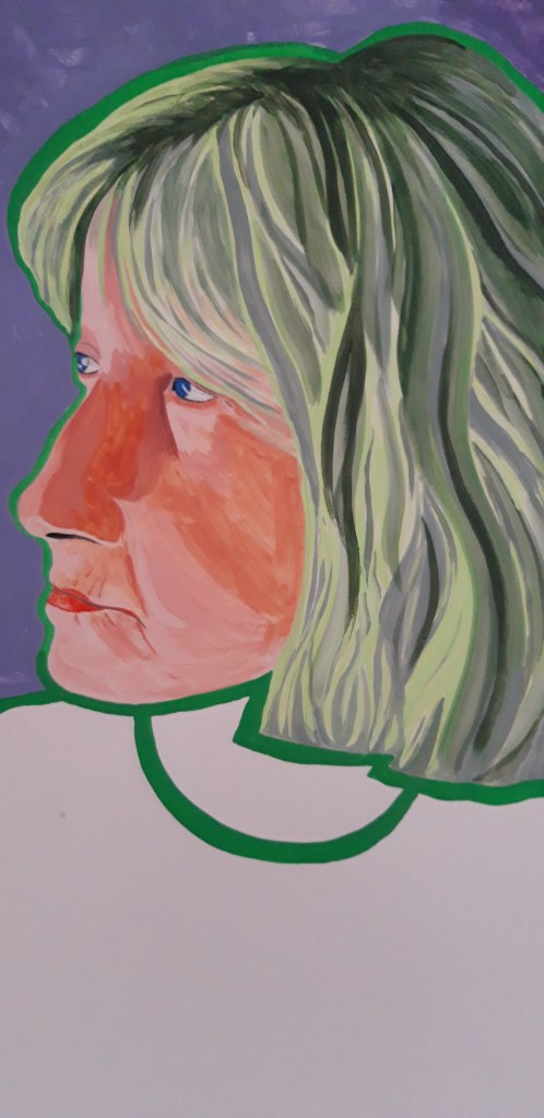 The green hair seems to be a left over from the earlier cartoon characters. The absence of neck and body definition plays an integral role in the composition and remains a strong presence in the work through the use of white space and the coloured outline.