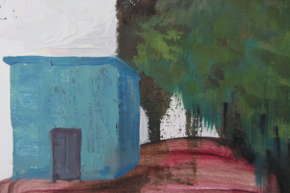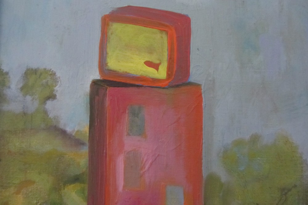 The Cube Series of paintings (oil on canvas) presents a body of work about time and obsolescence. TV monitors, computer screens and fish tanks are stacked on top of dwellings. The properties appear empty and the landscape unpeopled.